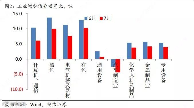 从已公布的行业数据来看,7月多数行业同比增速出现回落。黑色、有色金属冶炼及压延加工业等供改组行业跌幅居前,而计算机、电气机械、通用设备、汽车制造等非供改组行业也出现普遍回落,显示经济增长动能全面走弱。