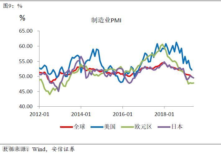 这个情况从全球的角度来看也有类似之处。最近公布了6月PMI的初值,欧元区PMI已经连续四个月在47.5-48之间震荡,且明显低于15-16年;日本PMI已经连续五个月在50左右震荡,与15-16年的低点也相当接近。美国PMI仍相对较高,仍有调整的压力,但从历史规律上看,下降幅度可能不大。因此,全球经济可能将保持弱势,但快速下滑的阶段或即将过去。