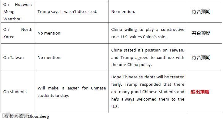 从中美双方的声明来看,在最重要的关税问题上,结果与市场预期大致相符;但对于其他的一些问题,特别是华为问题的表述,是超出市场预期的。