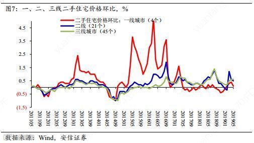 经济需求端其他分项来看,基建的回升更多取决于政策意愿,消费看起来仍处于趋势下行中,地产投资的走向是否能支撑投资变得尤为关键,我们倾向于认为地产投资趋势下行的可能偏低,支撑地产投资年初以来仍然偏强的主要因素或许仍是低库存,经历了一年房地产市场的补存货,目前全国范围内的存货水平仍然偏低。目前二三线住宅价格的低点相对14年库存过剩时有显著抬升,显示存货水平可能仍有上升的空间。