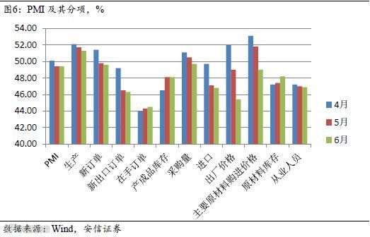 6月30日公布的PMI读数为49.4,与上月持平,略低于预期的49.5。从分项上看,本月PMI有两个关注点:第一,相比上月,PMI主要分项的下滑幅度明显趋缓;第二,价格指数明显走弱。