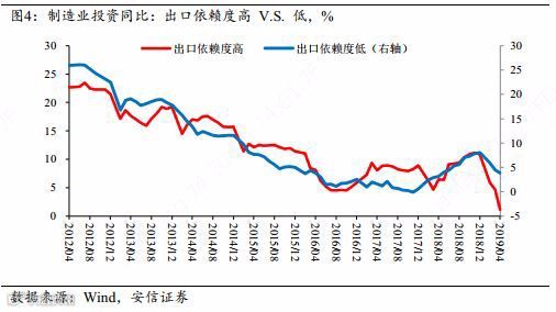 中美贸易战对中国的投资活动影响如何?我们观察制造业投资的情况,按照各行业出口依赖度的情况,将制造业投资分成两类。