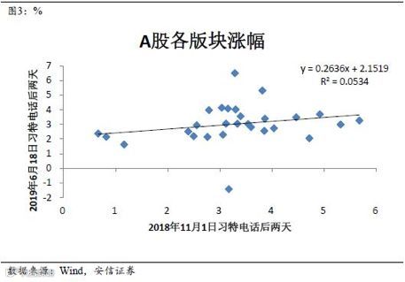 这里最主要的上涨逻辑是市场整体风险偏好的提升。从2018年11月1日和2019年6月18日两次习特电话后市场的表现来看,各版块呈现的是普涨行情,各版块在两次事件的上涨幅度之间的相关性并不显著,结构差异并不明显。