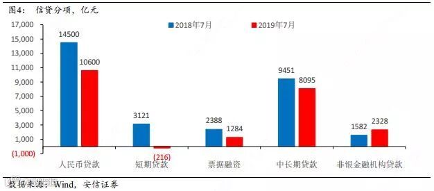 7月人民币贷款、非标融资的大幅收缩共同拉低社融增速。而短期贷款、中长期贷款和票据融资纷纷走弱带动信贷大幅回落。