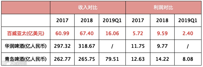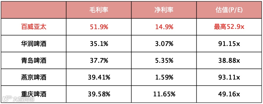 百威亚太近两年收入和净利润均有一定增长。公司与其他同行业的公司盈利能力对比如下,可以看到公司毛利率比国内同行高出一截: