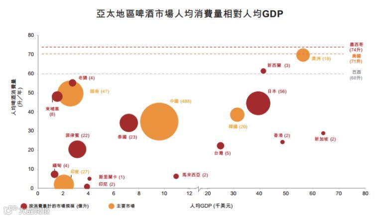 整体亚太地区啤酒人均消费量亦远低(于2018年约为20升)于全球基准市场(如美国、巴西及墨西哥于2018年分别为71升、60升及74升),这可透过下图予以说明,其按人均消费量及人均GDP划分多个区域性啤酒市场。亚太地区当前较低的啤酒人均消费量水平表明该地区啤酒市场增长空间巨大。