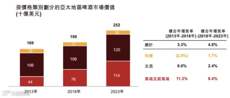 高端化及升级交易是亚太地区啤酒市场的结构性趋势。相对全球其他市场而言,亚太地区的高端及超高端啤酒类别相对欠发展,预计其增速会大幅高于该地区整体啤酒市场的增速。下图列示按消费量及价值计亚太地区按价格类别划分于2013年至2018年的啤酒市场历史演进及于2018至2023年的预计演进,说明啤酒市场的区域性高端化趋势。