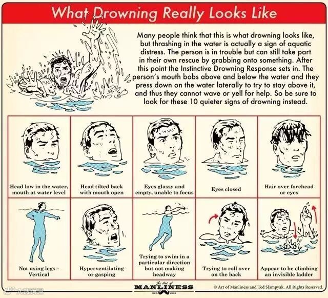 人溺水,时是“站”在水里的,而且很安静,或者像是在水中垂直“爬楼梯“,最最重要的是,身体是垂直的!电影电视剧里演的都是骗人的!并不会呼叫、挣扎或平躺在水里!