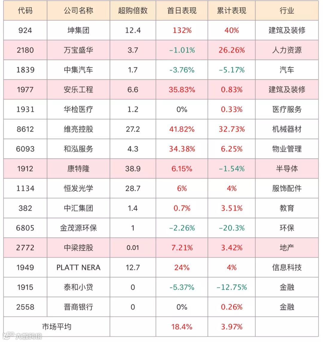 可以看到,由于新股有中签率的影响,实际收益率比新股首日的表现有所不同,首日涨幅不大的新股,若中签率不高,有可能会导致实际收益为负值。有意思的是我们发现还有一种情况,即公司股票首日涨幅并不算太高(如上图的中梁控股),但由于中签率很高(中梁控股中签率100%),那么可能导致实际收益比一些首日涨幅较高的公司(如上图的安乐工程)带来的实际收益还要高。