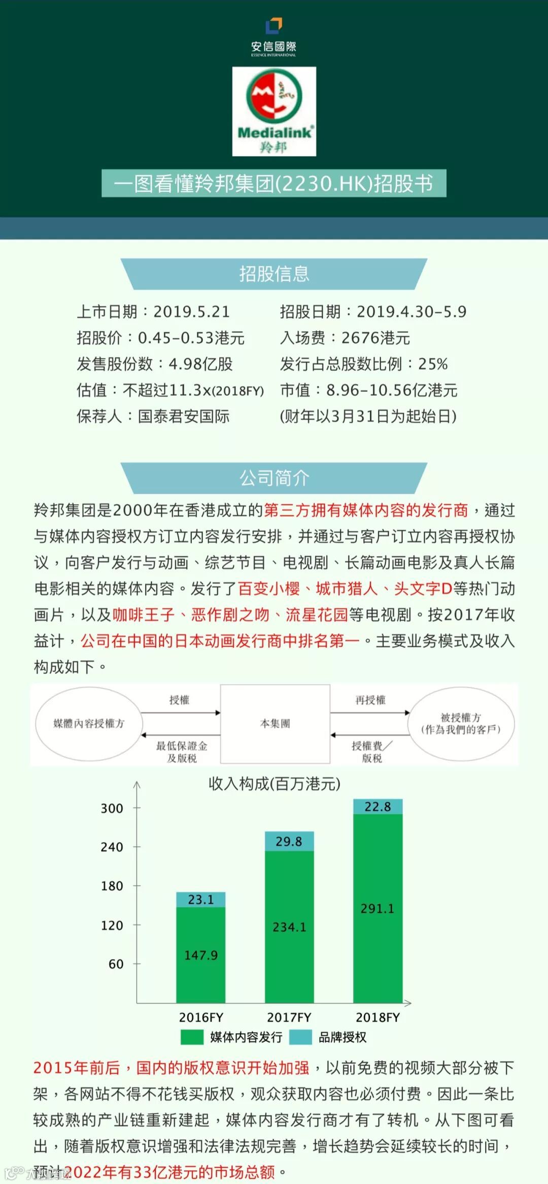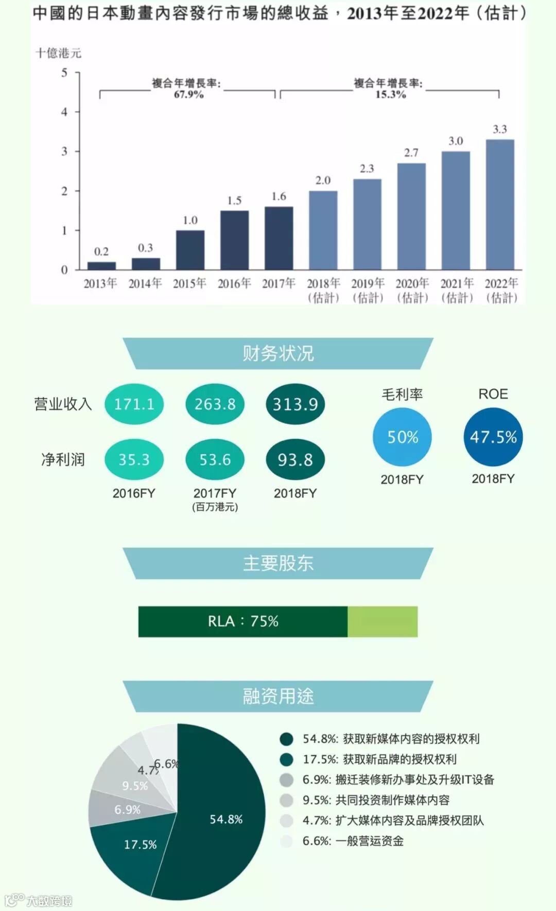 2)公司从Aniplex、Avex Pictures、角川集团、Sunrise和东宝等日本媒体公司获得内容授权,且与五大供应商建立2至17年的关系;且下游十大客户包括ABS-CBN、阿里巴巴集团、B站、东森电视台、爱奇艺、Netflix、腾讯及TVB等,都是国内外的流量担当;