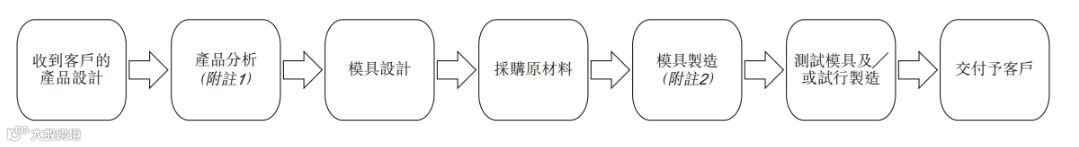 公司根据客户的规格为其设计、开发及制造定制模具,客户主要属于汽车及家居电器产品制造行业。公司也会不时将技术上复杂程度低的若干模具制造工序外判予第三方承包商。同时,也向客户提供部件加工服务。业务过程如下: