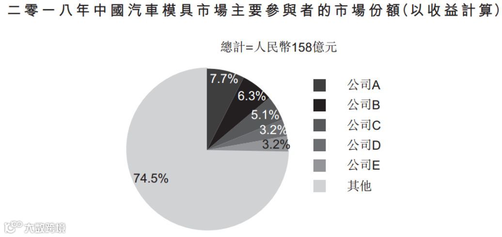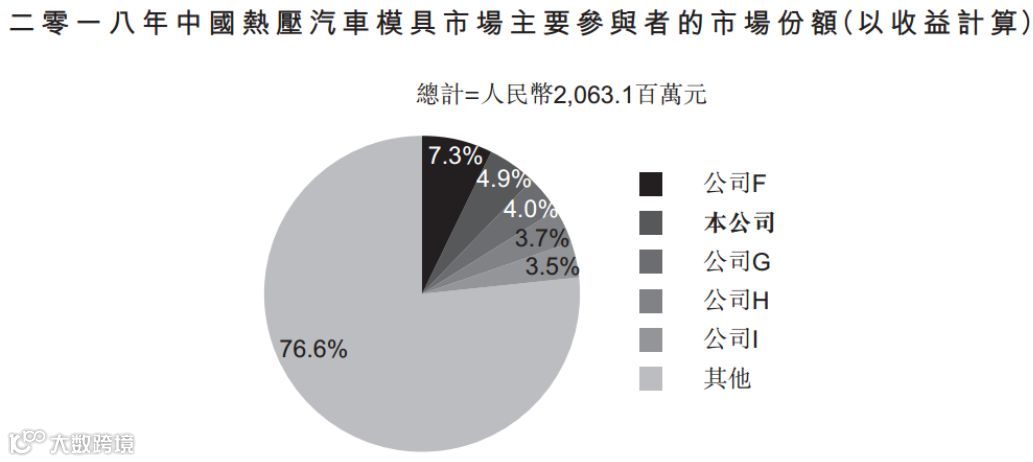 就汽车模具制造业产生的收益而言,公司在中国的市场份额为0.8%,而五大行业参与者占中国市场份额25.5%;在中国热压汽车模具市场,以2018年的收益计算,市场份额为4.9%,排名第二。