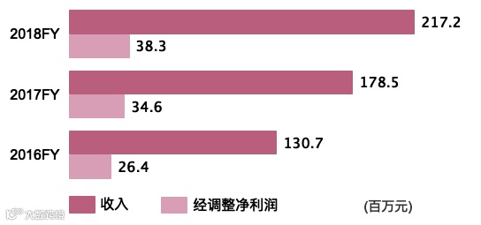 勋龙汽车在行业中份额虽不大,但营收增长迅速。2016财年至2018财年分别实现收入1.31亿元、1.78亿元和2.17亿元;实现经调整净利润分别约为2643万元、3461万元和3827万元。