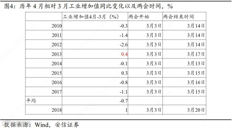 2018年4月工业增加值为7%,较3月大幅回升1个百分点,观察同期支出端的数据,投资、消费、出口均在回落,生产大幅走强而需求在回落,这背后体现了补库存的影响,当时除了有增值税率影响库存行为外,可能还有3月两会时间较以往更长、4月集中复工的影响。观察2010年以来4月相对3月工业增加值的变化,其均值水平为-0.7个百分点,最大值为0.4个百分点,如果我们认为去年两会对生产的影响与历史相比,没有出现重大趋势变化的话,那么2018年4月工业增加值比3月多增加的1个百分点中,可能有0.6个百分点来自于库存的影响。