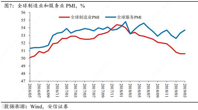 2017年末以来全球经济景气度持续下行,观察其中的分项,全球服务业维持高位,经济下行主要集中在制造业和贸易相关的领域,中美贸易摩擦、国内去杠杆的持续发力或许是造成全球经济活动减速的重要原因。目前中美达成一致协议的诉求逐步增强,国内去杠杆的纠偏进一步深入,叠加中国大规模减税降费的落地中国经济下半年有望企稳,届时全球经济的回落可能将进入尾声。