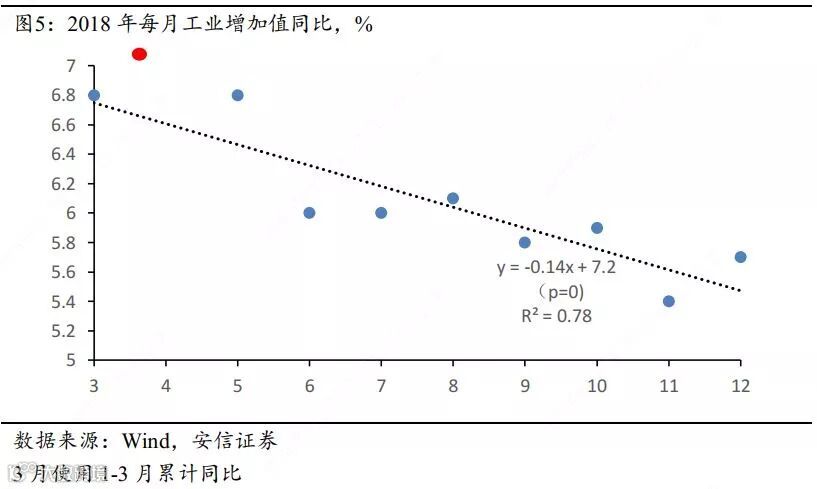 此外还可以通过2018年全年的工业增加值进行拟合,通过拟合值和真实值的差来衡量库存调整的影响。不难发现,如果按照去年正常的趋势,4月工业增加值为6.6%,而其实际值为7%,可以大概推断其中有0.4个百分点来自于库存的影响,与之前的估计结果差别不大。