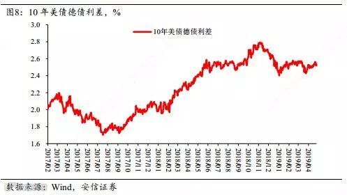 近期美国经济持续向好,欧元区经济数据持续承压,进而推动美元指数持续上行。从海外债券市场的表现来看,美债收益率下行幅度有限,而德国10年期国债收益率再次跌入负区间,显示市场对欧元区经济预期更为忧虑,看起来这一趋势在未来一两个季度或许仍将延续,这将对美元指数和美债德债利差形成支撑。