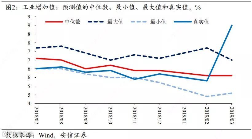 假定市场机构在进行工业增加值预测时充分考虑了经济运行情况的变动、季节因素的扰动等诸多情况。事实上,以去年下半年至今年2月的情况来看,市场机构对工业增加值的预测整体偏差不大,真实值基本处于预测的最大和最小值之间,预测的中位数与真实值的最大偏离为0.6个百分点,当然也可以发现预测值中位数相对真实值整体偏高,体现市场对经济的预期略微乐观。
