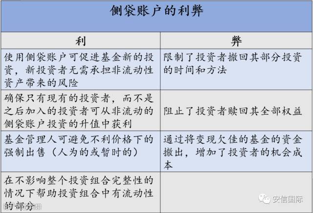 基金资产将被分成两个互相隔离或独立的法定投资工具,投资者只能知道侧袋账户外的基金资产净值。