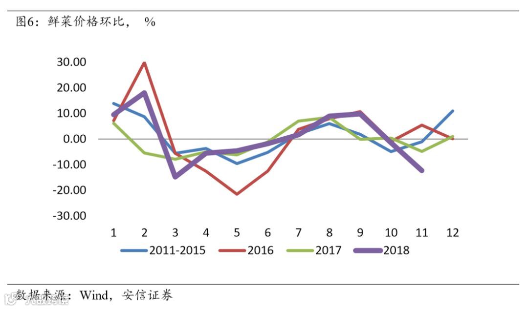 11月CPI同比2.2%,略低于预期。核心的拉低因素是菜价和油价。天气原因使寿光等地在8月份出现了明显的减产,导致了8-10月菜价的高涨,同时也会刺激供应导致11月菜价的大幅下跌。根据以往菜价周期4-6个月的规律,菜价的调整还会持续一两个月。尽管对油价的预测较难,但10-11月油价下降对CPI的影响显而易见,是导致11月非食品CPI下降的主要原因。