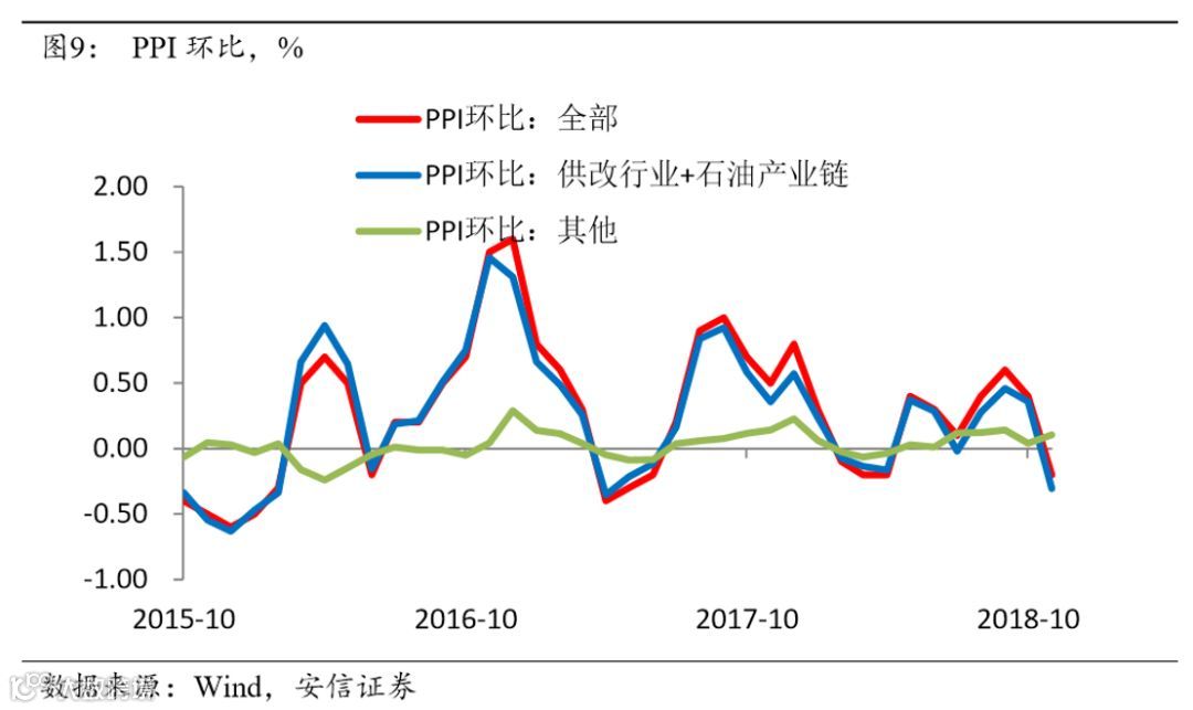 11月的PPI基本符合预期,主要关注点在油价和黑色产业链的价格。正如我们预测的那样,供改行业的供给在高利润+环保放松的刺激下持续恢复,而需求端在边际放缓,从而导致供改行业特别是黑色产业链的价格将有持续的压力,直到利润回到合理水平。因此,2019年的PPI将有下行压力,如果油价不出现明显反弹,通缩风险可能会出现;10-11月的价格下降可能只是前奏。