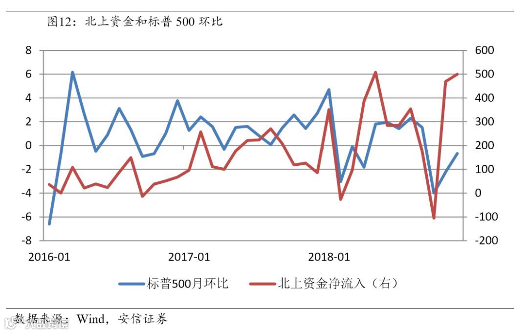 另一方面,我们之前发现标普指数月环比与北上资金净流入存在明显的相关性,但最近有一些新的变化。尽管11和12月标普指数月环比仍然为负,但是北上资金大幅净流入,这可能是因为A股的表现要优于美股及其他股市所致,我们猜测这和A股、港股的估值较低以及10月底以来国内陆续出台许多纠偏政策有关。