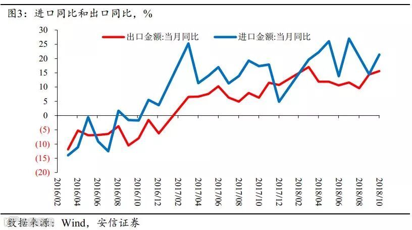 新近公布的进出口数据显示,10月美元计价出口同比15.6%,较9月增速上行1.2个百分点;美元计价进口同比21.4%,较9月增速大幅上行6.9个百分点。