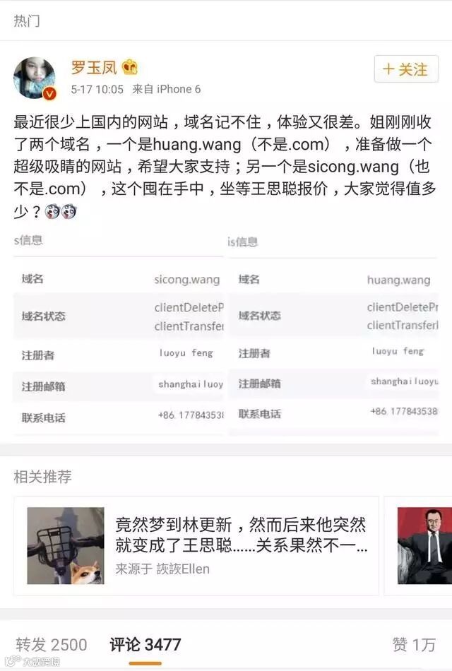 最近罗玉凤又搞事情了,她微博上自爆注册了两个域名,名字可厉害了!一个叫黄网,她说要弄个超级吸睛的名字,果然很吸睛啊!