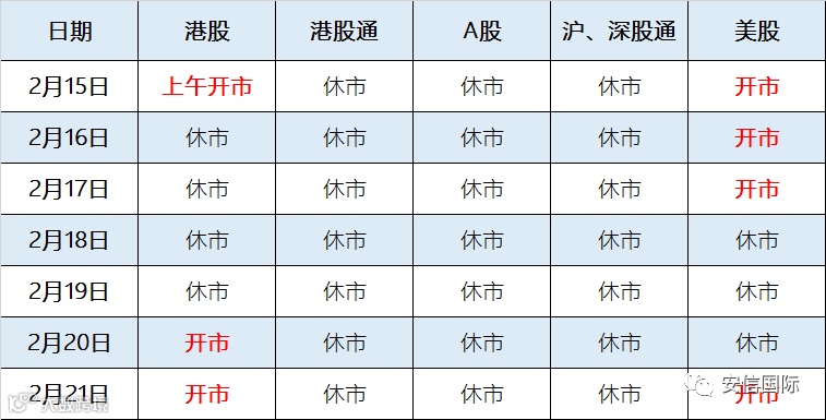导读:因新春假期,证券市场休市安排如下:港股今日(2月15日)上午开市
