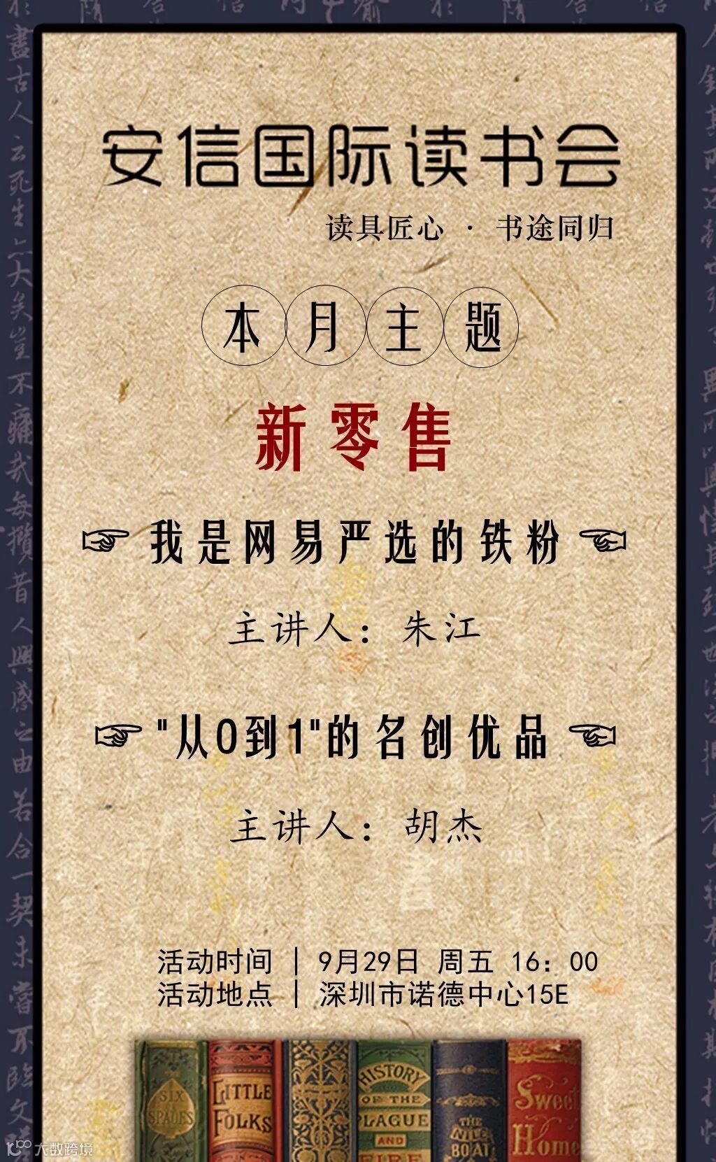 安信国际拟于本周五(9月29日)下午4点在深举行9月读书会活动,本期主题为新零售,内容包含网易严选和名创优品这两种新零售的商业经营模式解析,活动安排如下图,欢迎各位拔冗参会。