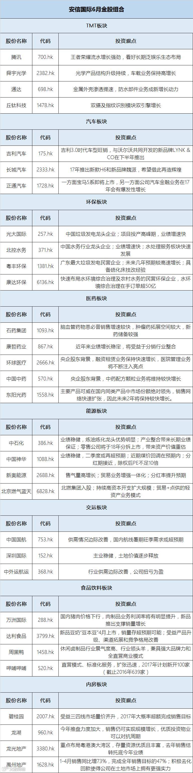 导读:安信国际发布6月精选港股组合,具体内容如下。