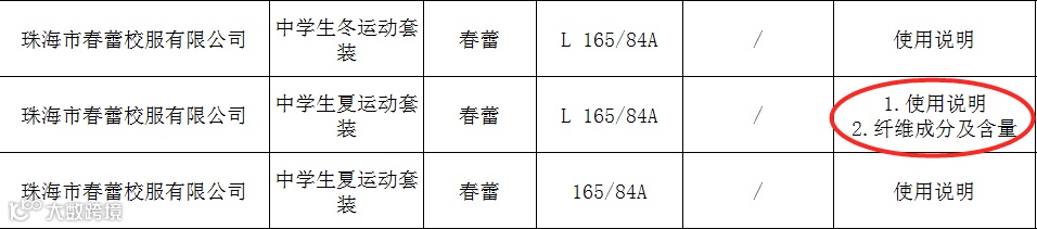这次抽查不合格的涉及珠海市春蕾校服有限公司3个批次产品,包括中学生冬装运动套装、中学生夏运动套装两个型号,其中中学生冬装运动套装L165/84A、中学生夏运动套装165/84A不合格的项目为“使用说明”, 中学生夏运动套装L165/84A不合格的项目为“使用说明”以及“纤维成分及含量”。