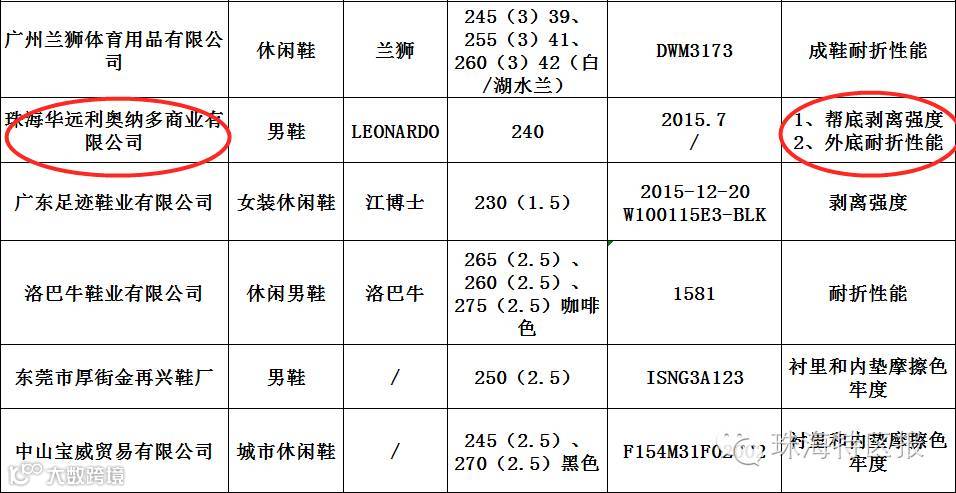 其中,检验发现,由珠海华远利奥纳多商业有限公司生产的商标为LEONARDO,型号规格为240的男鞋两个项目不合格,分别是帮底剥离强度和外底耐折性能。