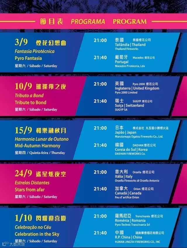 队伍:十支参赛队伍将献上五晚精彩的烟花表演