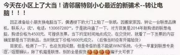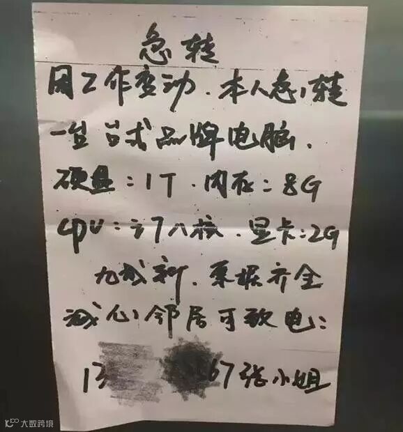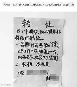 小编有次下班回家,刚好碰见“邻居”在小区墙上新帖的小广告,大致内容如下:"因工作变动,本人急转一台台式品牌电脑 …… 九成新,票据齐全,诚信邻居可致电—— 13X XXXX XXXX 张小姐。"(如下图)