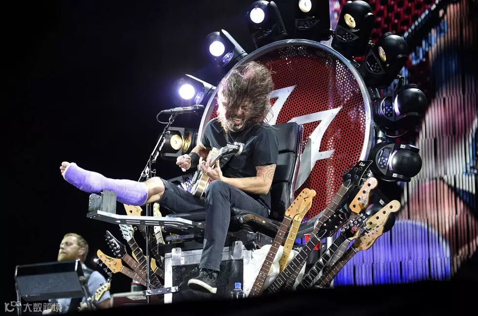 2015年7月4日,喷火战机乐队的Dave Grohl坐在吉他做底座的椅子上弹唱,他早前在瑞典的一场演出中因为意外摔断了一条腿。