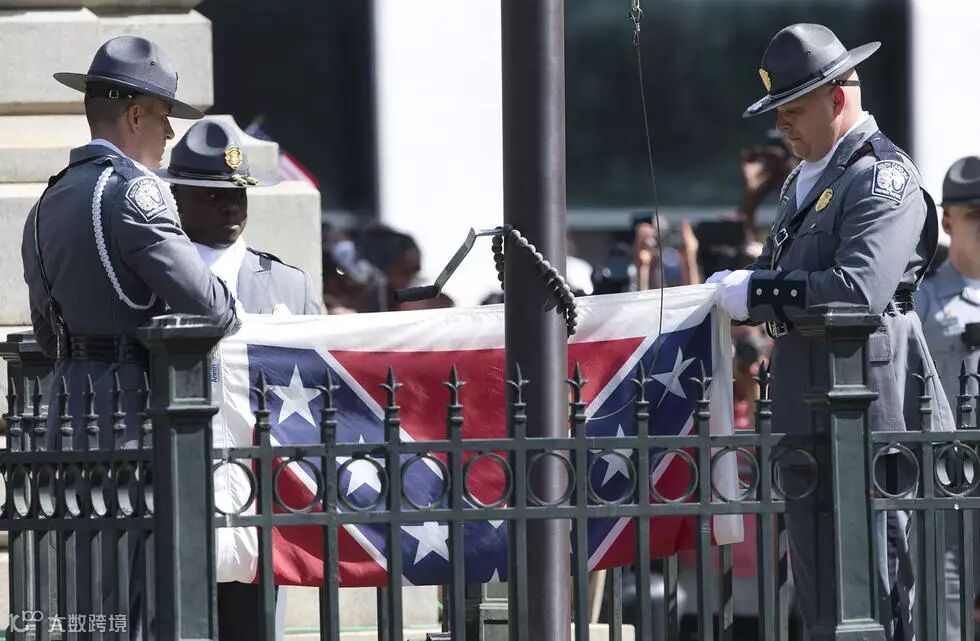2015年7月10日,南卡罗来纳州公路巡警正在州议会大厦降下南部联邦战旗,结束了其54年的悬挂。这面旗子的存在已经争议了数十年,最终因为6月17日针对非裔卫理公会新教教堂的惨案事件退出历史舞台。