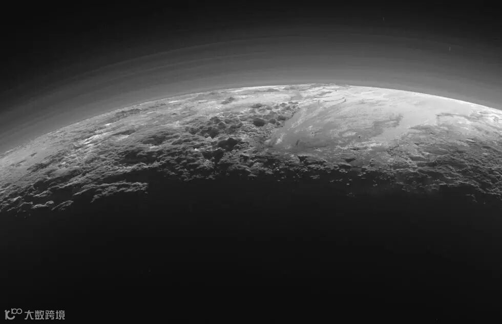 2015年7月14日,在地球到达距冥王星最近的点后的15分钟,美国宇航局NASA拍下了这张日落前冥王星表面的崎岖的冰川和平坦的冰原,逆光突出了冥王星稀薄但膨胀的大气层,拍摄点大概距离地球17702千米。