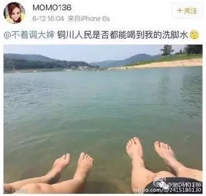 有些人充分发挥了恶搞的本性。近日,一女子在陕西铜川一水库洗脚,随后在网上发了一张露着四条腿放在水里的照片,写了这样一句话:“铜川人民是否都能喝到我的洗脚水。”遭到网友的愤慨:“在水库洗脚的二位,铜川不欢迎你们这样的客人!”