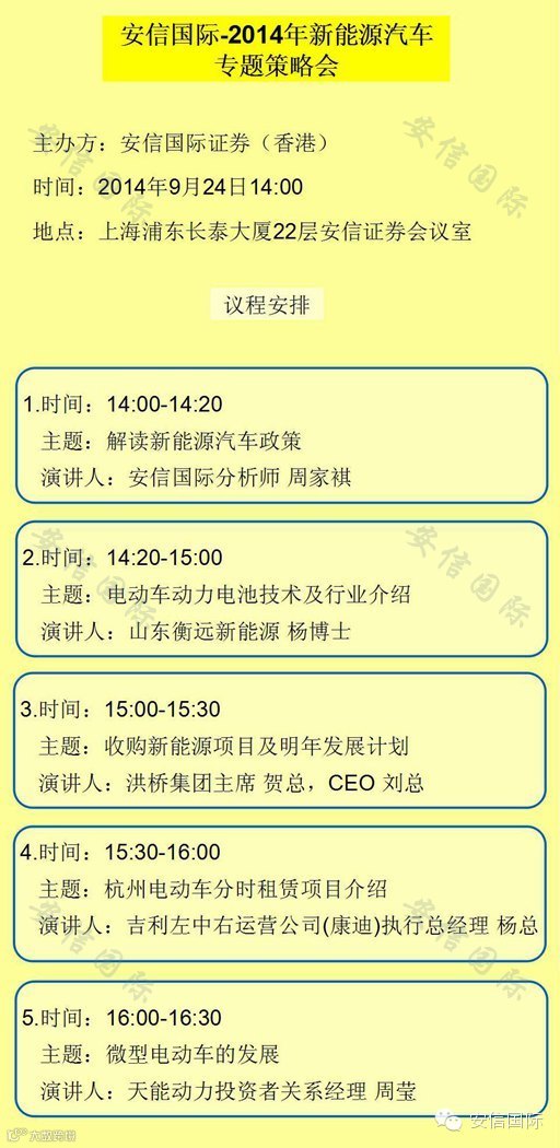 前言:2014年被认为是中国新能源汽车市场化的元年,国家也是从政策上持续推进产业发展。在这样的大背景下,究竟有哪些投资机会?安信国际证券(香港)特邀请新能源汽车相关的上市公司和专家为您答疑解惑,一共探讨行业的投资机遇。