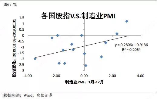 全球各项资产在2月的表现显示,市场已经开始对全球经济下行做出反应。首先,即使美国经济最近仍有韧性(制造业PMI反弹、非农就业大超预期),但除了原油外的大宗商品价格仍然走弱,说明市场依然看淡全球需求。其次,除了美国经济读数较强,其他经济体大都较弱,这与美元指数走强、欧元和新兴市场汇率走弱相对应。再次,各国1月制造业PMI与12月制造业PMI的差值和各国2月股市指数的表现呈明显的正相关关系。