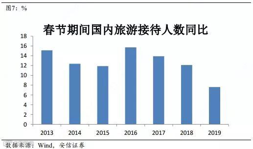 2月上旬正逢春节,少有生产方面的数据。但从相关的消费数据上看,经济下行趋势还未结束,仍需政策呵护。2019年春节期间国内旅游接待人数同比7.6%,自2009年以来首次呈个位数增长,比2018年的同比12.1%大幅回落4.5%,同比降幅已经超过2014-2015年的经济下行期。另外,2019年春节假日前三天的的观影人次,较2018年同期下降13%左右,也体现了消费方面的不振。