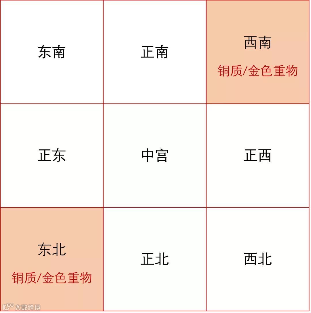 今年西南和东北分别为五黄灾星及二黑病星位,二者皆对健康不利,必须注意家中梳化、睡床及公司中的坐向是否处于这两个方向,因为在病位长期坐卧皆会容易引发大病小痛。所以,西南和东北皆要避忌动土及拜访红黄两色物品,宜放铜质或金色重物加以化解。