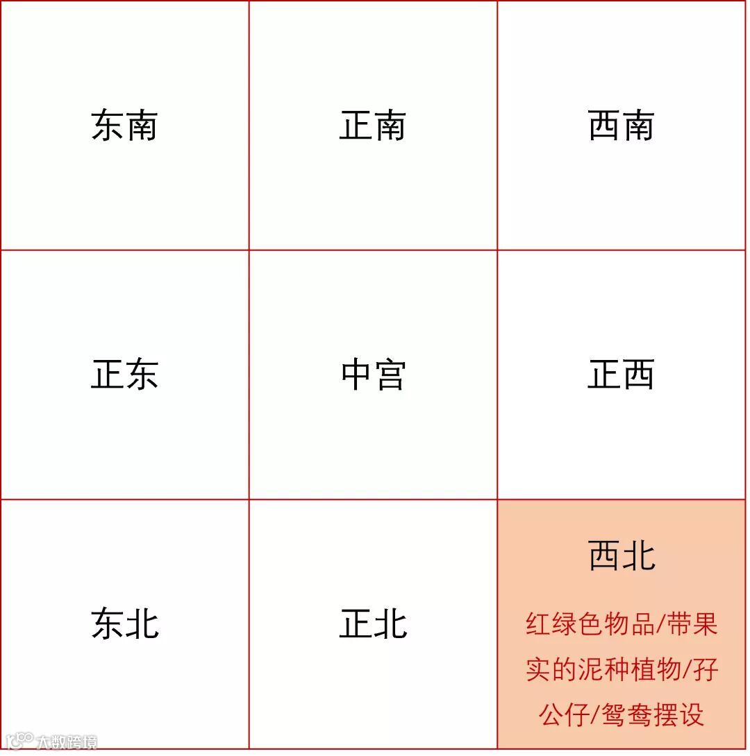 本年的西北是喜庆位,代表一切喜事,尤其有利于嫁娶或生儿育女。可于家中多放红色、绿色物品或带果实的泥种植物,孖公仔或鸳鸯摆设亦是对想结婚的情侣有帮助。