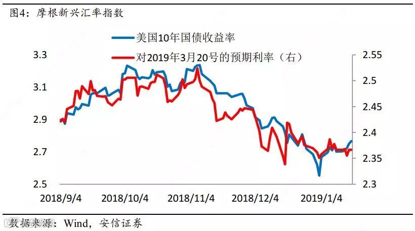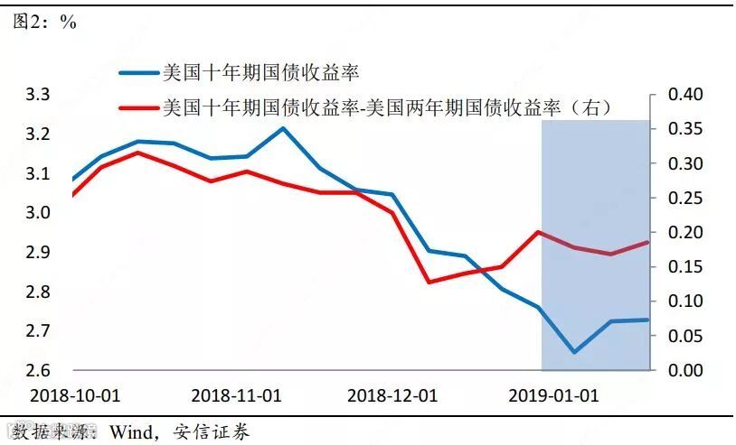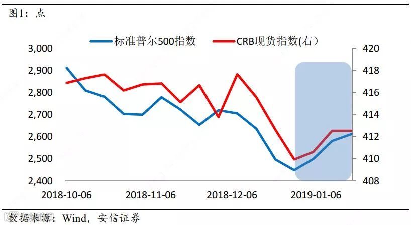 2018年圣诞节以来,全球资本市场显著的从Risk Off模式转向Risk On模式,这一转变在各类资产上都有相应的体现。美国股市和大宗商品指数出现明显的反弹,其中股市反弹的更为明显,从低点反弹了13.6%左右。同时,美国十年期国债收益率从低点的2.55%回升至2.79%左右,反弹了二十多个BP。