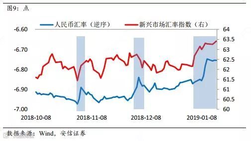 从1月以来的走势上看,人民币升值和新兴市场汇率指数上升的幅度基本一致,都强于美元指数的下降幅度。这说明除了美元走弱的影响外,“Risk On”模式的转变可能是导致近期人民币汇率升值的重要原因。