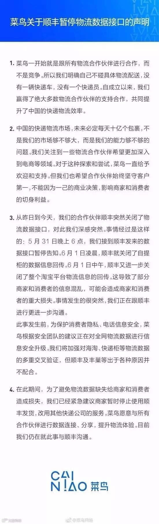 菜鸟方面表示,对此感到很突然,正在与顺丰紧急沟通。在此期间,菜鸟建议商家暂时改用其他快递公司发货。