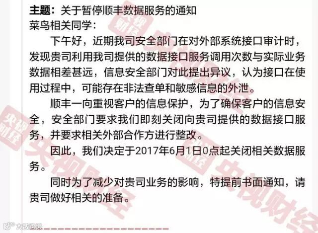 顺丰控股股份有限公司公关总监陈欢接受央视财经记者专访时回应:“肯定不是突然做的决定,实际上是在昨天下午31号六点左右。我们先以邮件的方式正式通知对方。我们暂停数据接口,其实是出于信息安全的考虑,实际上对于我们商家也好,消费者是不会产生影响的,消费者依然可以通过我们官方的渠道查询物流信息。但是有一个重要的事实,菜鸟对于顺丰的封杀,第三方平台介入的封杀,是会对商家产生影响,而且有一个最新的情况就是淘宝已经把顺丰从发货物流选项当中剔除掉。”