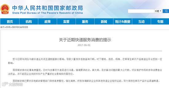 国家邮政局昨晚(6月1日)发布公告称,受今日菜鸟网络与顺丰速运关闭互通数据接口影响,导致少量快件信息查询不畅,时下樱桃、荔枝、杨梅、芒果等生鲜农产品寄递业务会受到一定影响。国家邮政局对此事高度重视,已及时与当事双方高层进行沟通,强调要讲政治,顾大局,寻求解决问题的最大公约数,切实维护市场秩序和消费者合法权益,决不能因企业间的纠纷产生严重的社会影响和负面效应。