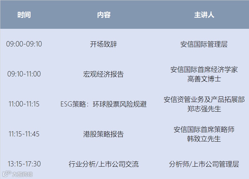 我们同时会邀请40多家极具投资价值的香港上市公司与投资者交流。诚邀各位上市公司高管、产业专家、机构投资者拨冗参加本次大会!我们将与您共同深入探讨与交流,安信国际致力为您搭建价值投资的平台!